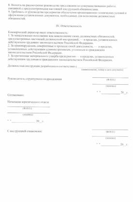Поэтому внимательно прочитайте должностную инструкцию: начальник коммерческого отдела (в предприятиях торговли) на предмет пунктов обязанностей, где указаны специфичные направления. Начальник коммерческого отдела несет ответственность за невыполнение или несвоевременное выполнение возложенных настоящей должностной инструкцией обязанностей и (или) неиспользование предоставленных прав. Главная — Должностные инструкции — начальник коммерческого отдела (в предприятиях торговли).В данном каталоге представлены должностные инструкции по различным отраслям. Информация о файле: Скачать должностная инструкция коммерческого отдела